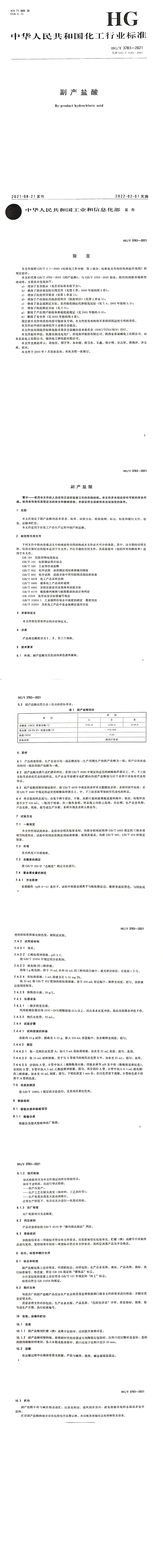 HG/T 3783-2021《副(fu)產(chan)鹽(yan)酸》,已于(yu)2021年8月21經(jing)國家工業和(he)信息(xi)化部(bu)發布(bu),并已于(yu)2022年2月1日起實施。